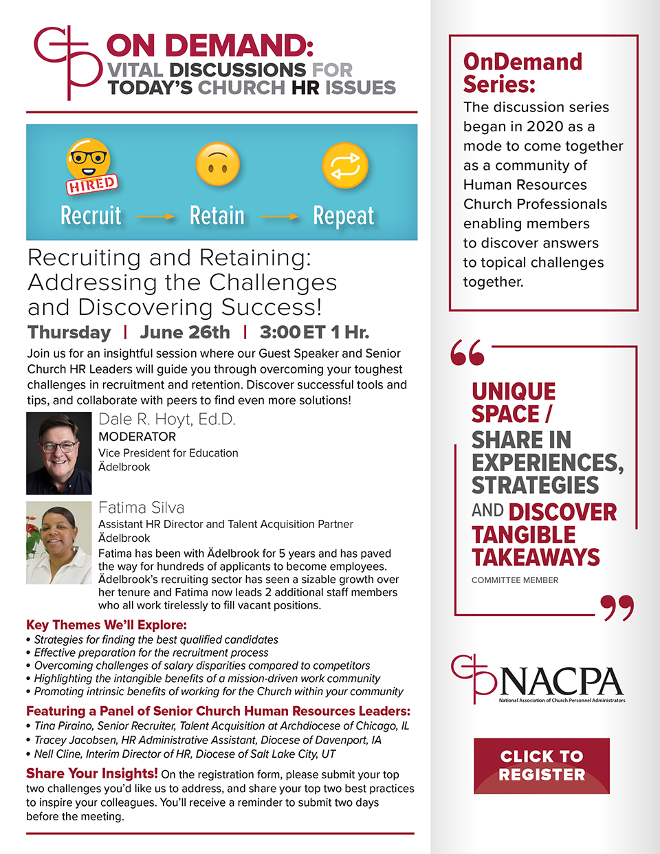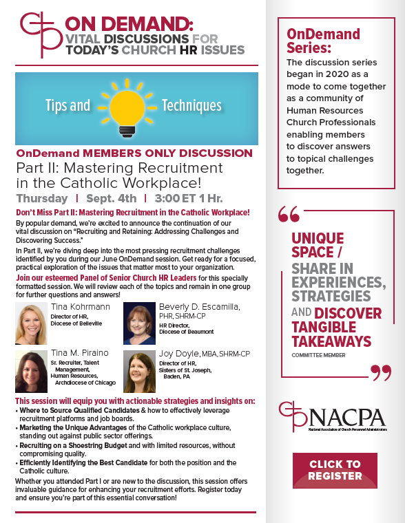 Back by popular demand! The Members-Only series, NACPA On Demand Discussion Series: Vital Discussions for Today’s Church HR Issues.