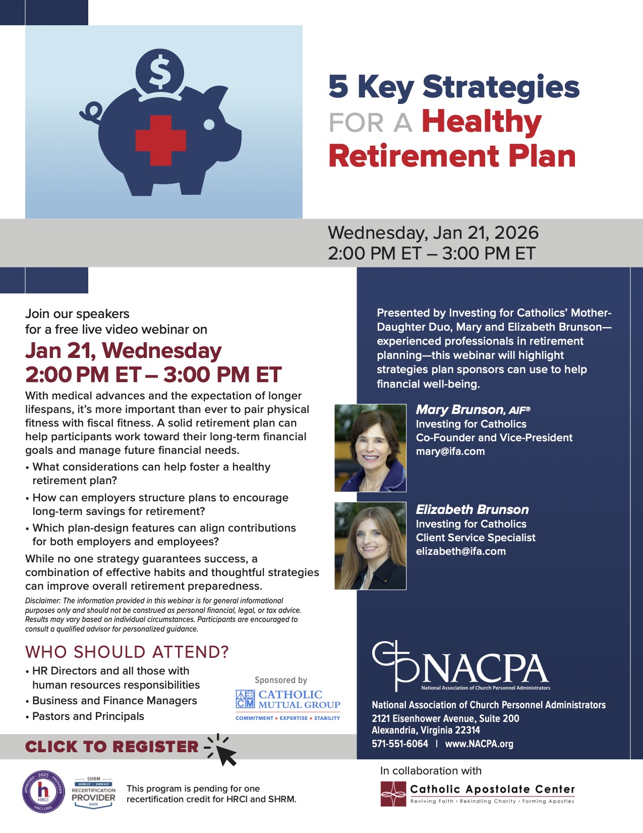 JAN 21 Healthy Retirement Plans with Mary Brunson, AIF®, Investing for Catholics, Co-Founder and Vice-President and Elizabeth Brunson, Investing for Catholics, Associate Wealth Advisor, Investing for Catholics Sponsored by Catholic Mutual Group